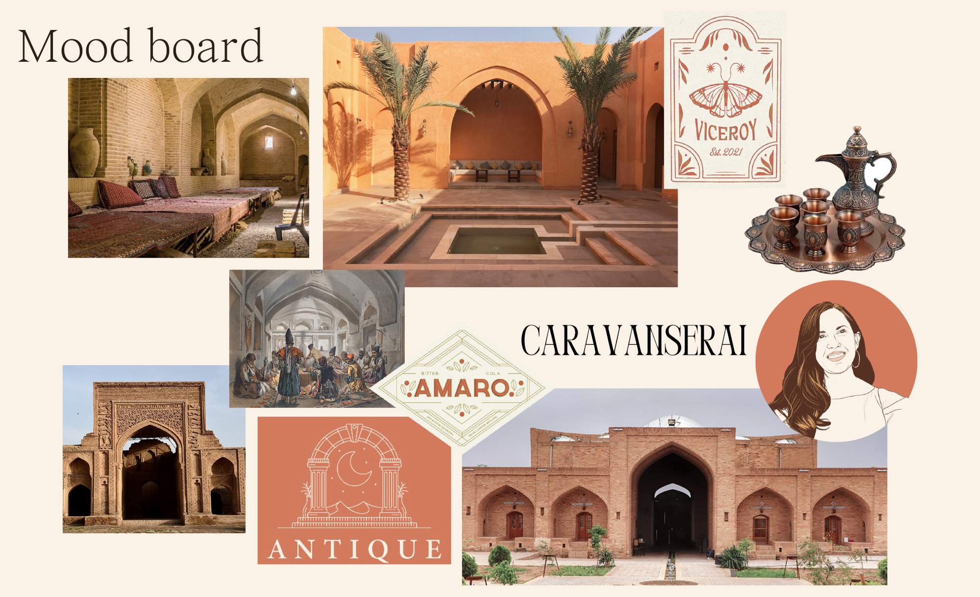 The logo is based on the architecture of the caravanserais. The middle arch is the entrance and the side ones represent the many doors of the inn. I added palm tree leaves for more warmth, to make it more inviting.