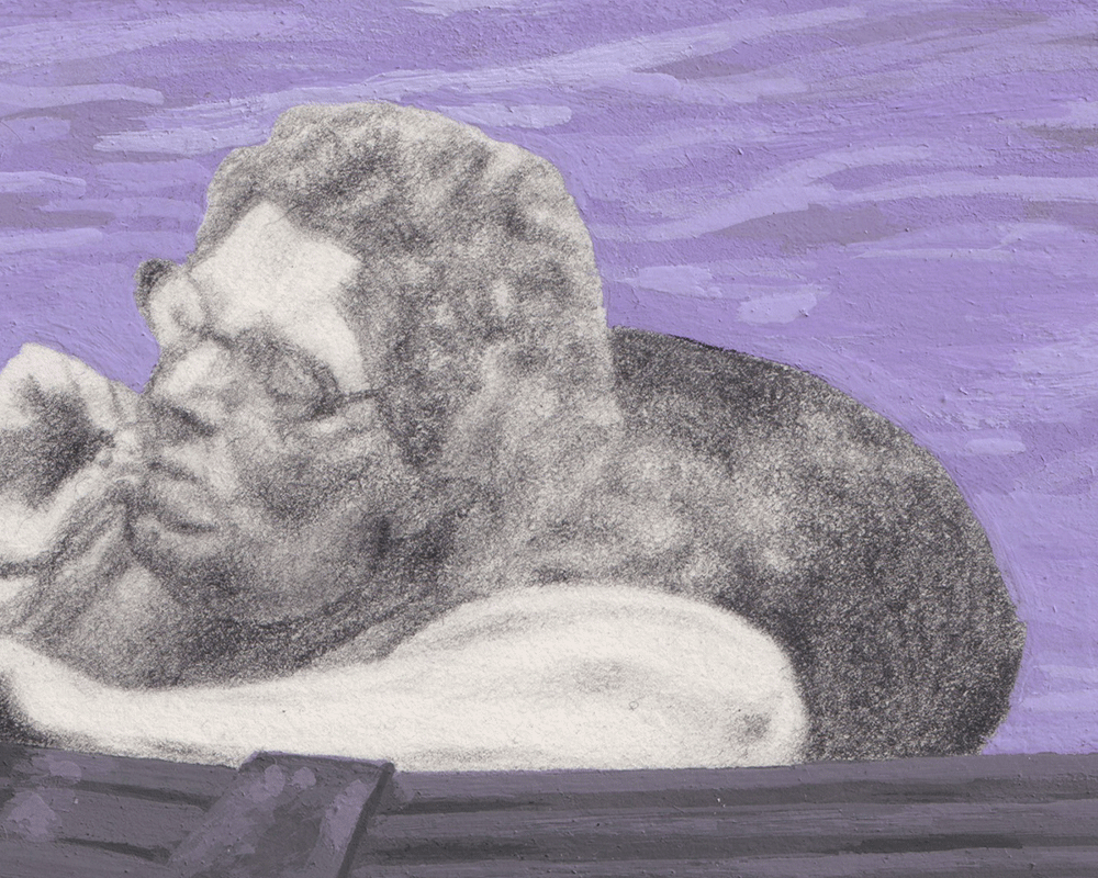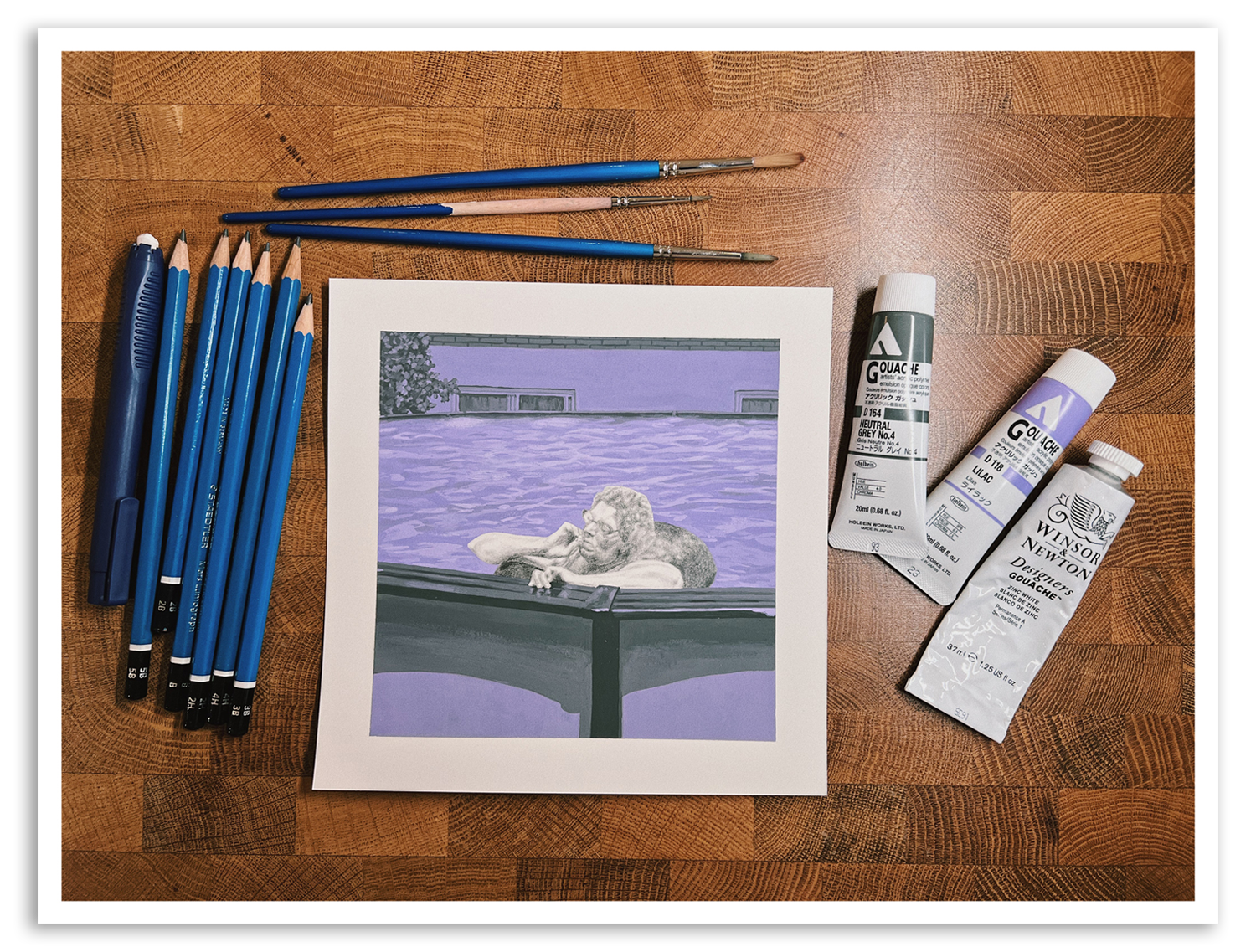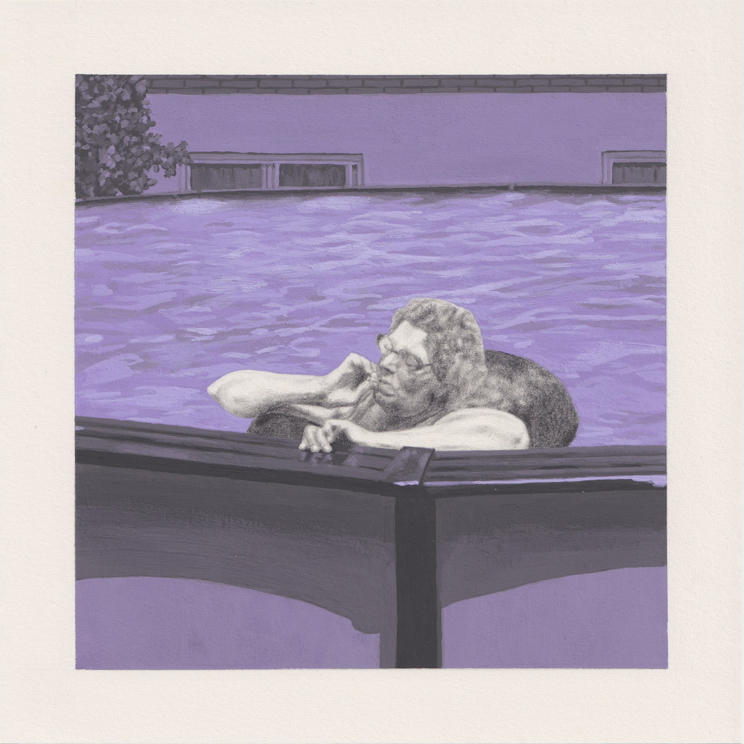 La Piscine, 2025. Graphite pencil and acrylic gouache on paperDolores—or Dolo, as she liked to be called because she hated her name—was absent-mindedly paddling around in the swimming pool. Floating around would probably be the more appropriate term, as she had a big tyre inner tube circling her, supporting her body.